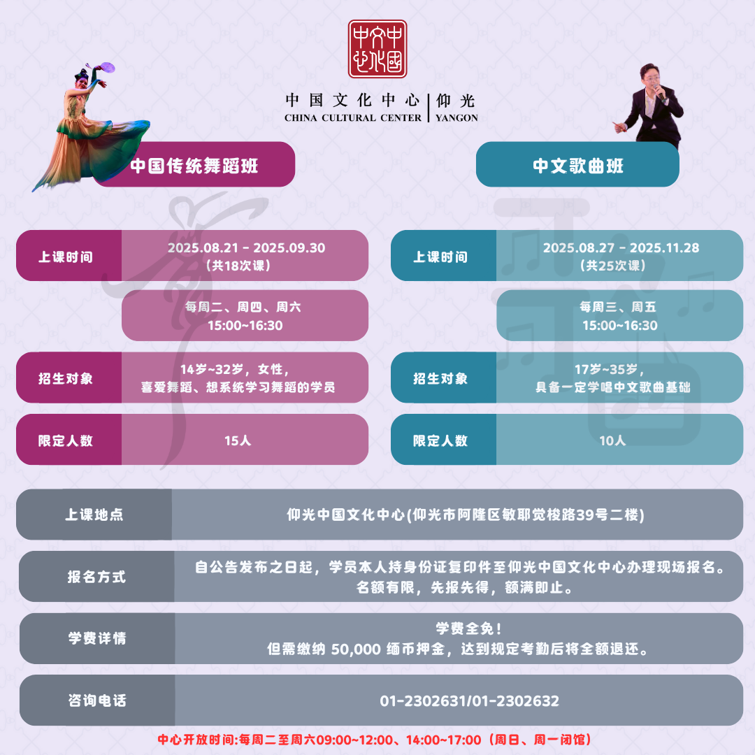 仰光中国文化中心预计于本月推出中国传统舞蹈班与中文歌曲班。趣味课堂,专业指导,零基础也能轻松入门。快来收获属于你的艺术时光吧!