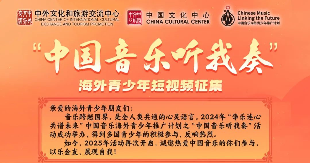 由中国中外文化和旅游交流中心在全球组织开展的2025“中国音乐听我奏”海外青少年中国音乐展示短视频征集活动启动啦!如果您或您的团队热爱音乐,并能够使用中国民族乐器进行演奏,请将视频发送给我们,将有机会进行全球展播,获得展播证书和奖品。具体是:一、征集时间2025年7月—2025年8月二、参与对象年龄在6至24周岁的海外青少年均可参加三、作品要求(一)内容要求视频需展示使用中国民族乐器演奏的音乐,曲目内容不限,单人演奏或集体演奏均可。整体风格积极向上、生动自然,有较强的表现力和感染力。(二)格式要求总时长小于5分钟,视频需横屏拍摄,比例位16:9,画质清晰、画面稳定,音画同步。视频格式为无压缩的...