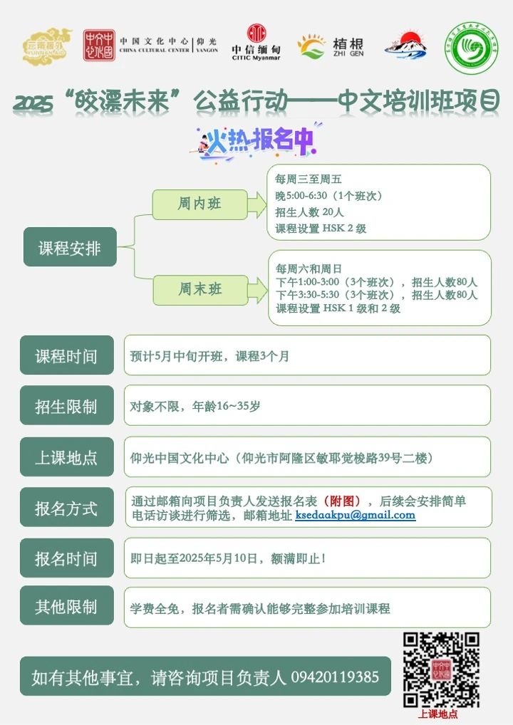 培训项目简介本期开设HSK 1与HSK 2,共设7个小班,课程时间灵活,周内周末任你选。中缅双语老师贴心辅导,专为缅甸学员量身打造。名额有限,速来开启你的汉语之旅吧!报名表下载链接https://docs.google.com/document/d/18jBzZw4CoQAj9P-F_yFIncdwcwLgx3uL/edit?tab=t.0