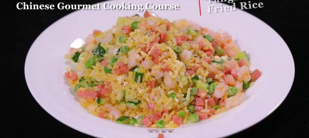 视频由世界中餐业联合会提供 扬州炒饭又名扬州蛋炒饭,是江苏省扬州市的一道传统名菜,属于淮扬菜。其主要食材有米饭、火腿、鸡蛋、虾仁等。 扬州炒饭是五颜六色的,鲜红的火腿躺在裹了蛋黄的白米上,黄瓜粒和翠绿的豌豆双双结伴,再加上一小勺亮晶晶的油,往顶上一浇,油滑光亮。鲜嫩多汁的虾仁,清香可口的米饭,色泽翠绿的豌豆,每一粒米都发出淡淡的香味,吃到嘴里,味道简直妙不可言。