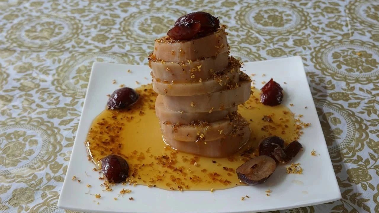 视频由中国文化网英文站提供 蜜枣桂花莲藕是中国独具特色的一道传统美食,以莲藕、糯米为主料,红枣、桂花、蜂蜜等为辅料制作而成。此食品甜香软糯,老少皆宜,风味浓郁。很多人喜欢吃蜜枣桂花莲藕,不仅因为它甜甜糯糯的美味,还因为它有着多重营养和保健价值。糯米益气补血,莲藕滋补清热,这样搭配煮熟后补脾养胃的功效十分显著。