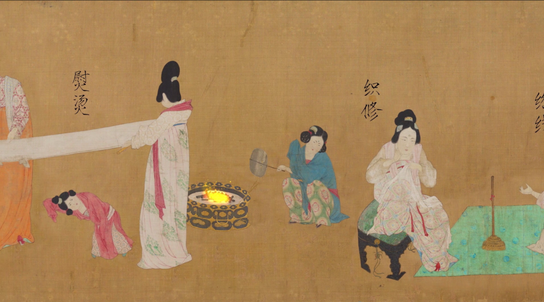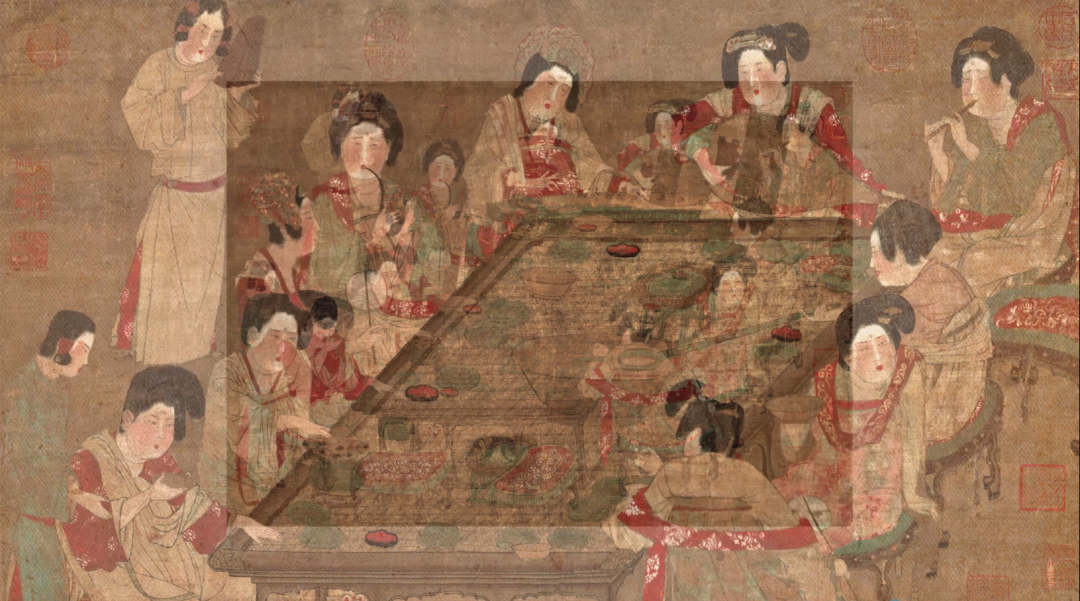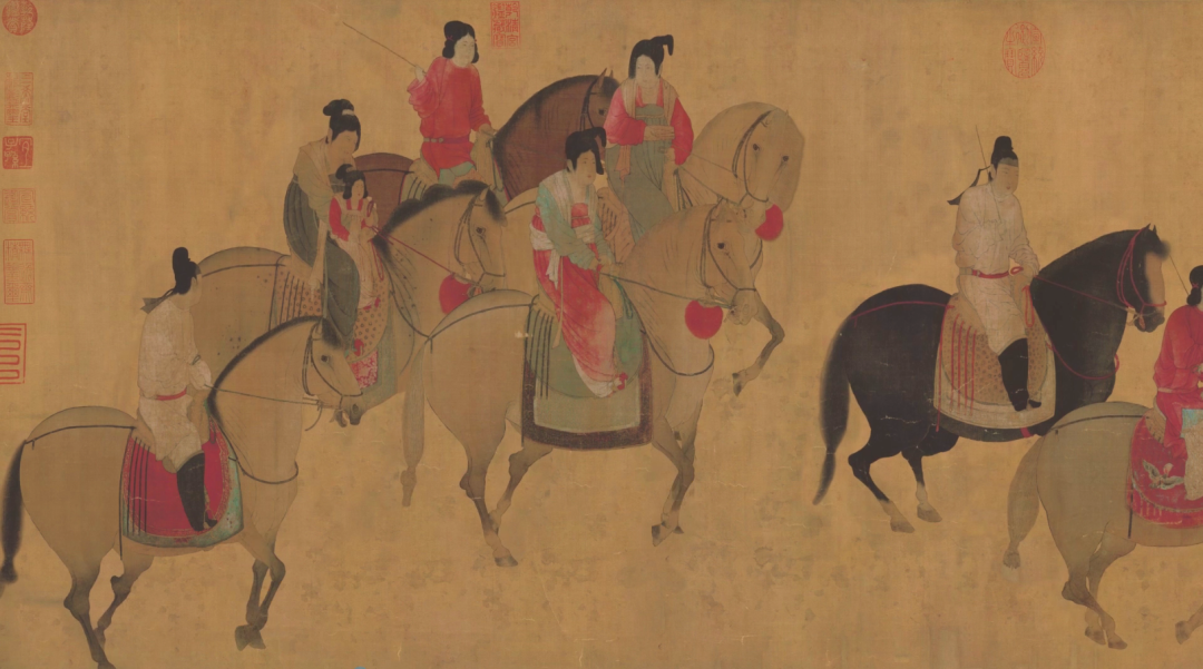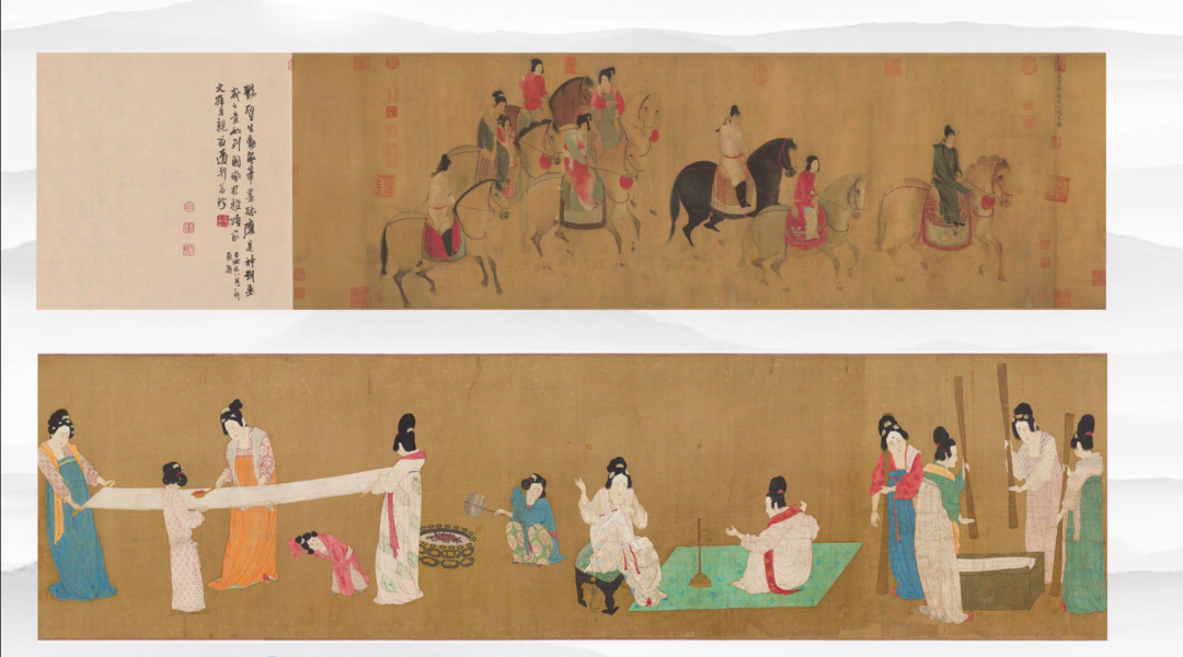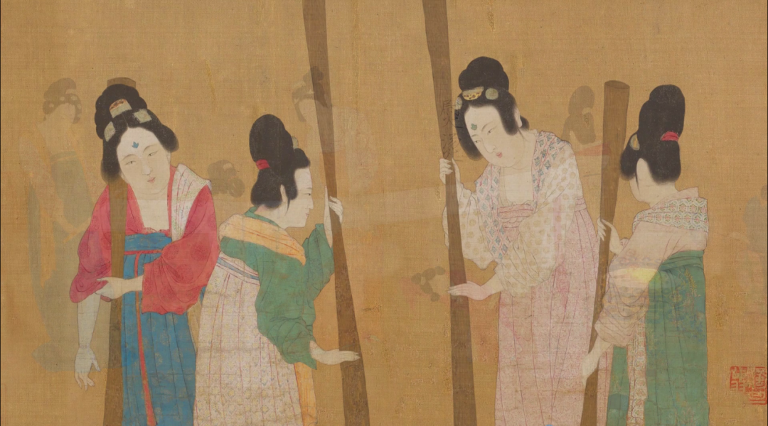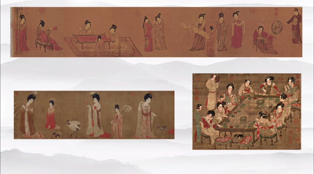 《唐宫仕女图》共由五幅唐代人物画组成,分别是张萱的《虢国夫人游春图》(现藏于辽宁省博物馆)、《捣练图》(现藏于美国波士顿博物馆)和周昉的《簪花仕女图》(现藏于辽宁省博物馆)、《挥扇仕女图》(现藏于北京故宫博物院)以及晚唐的《宫乐图》(现藏于台北故宫博物院)。