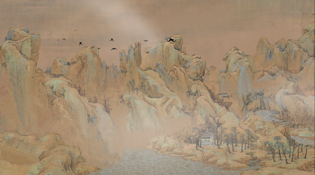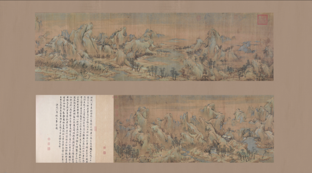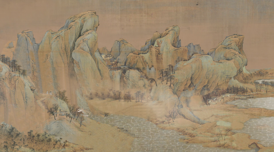 《江山秋色图》描绘的是北方山水的景色,画面布局严谨,勾勒精细,设色绚烂,以石青石绿为主,兼用朱、赭、白等色,色调明快和谐。整体画面充满文人的“士气”感,表达了作者对失去故土的思念之情。