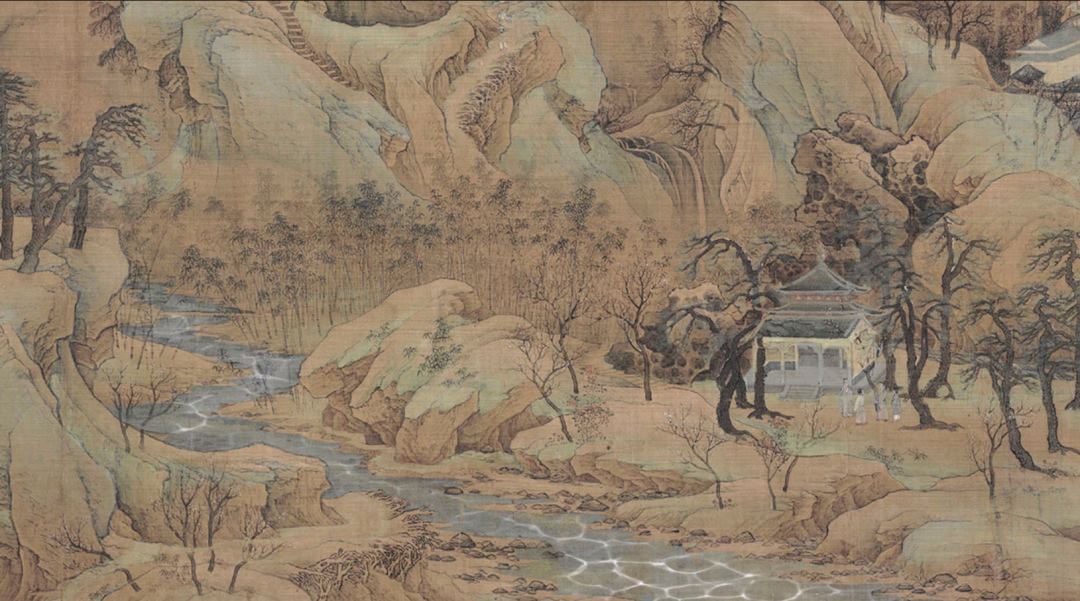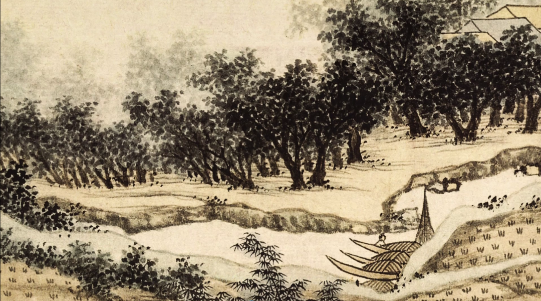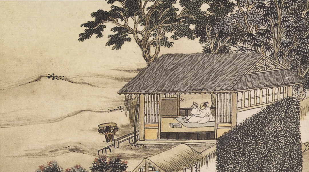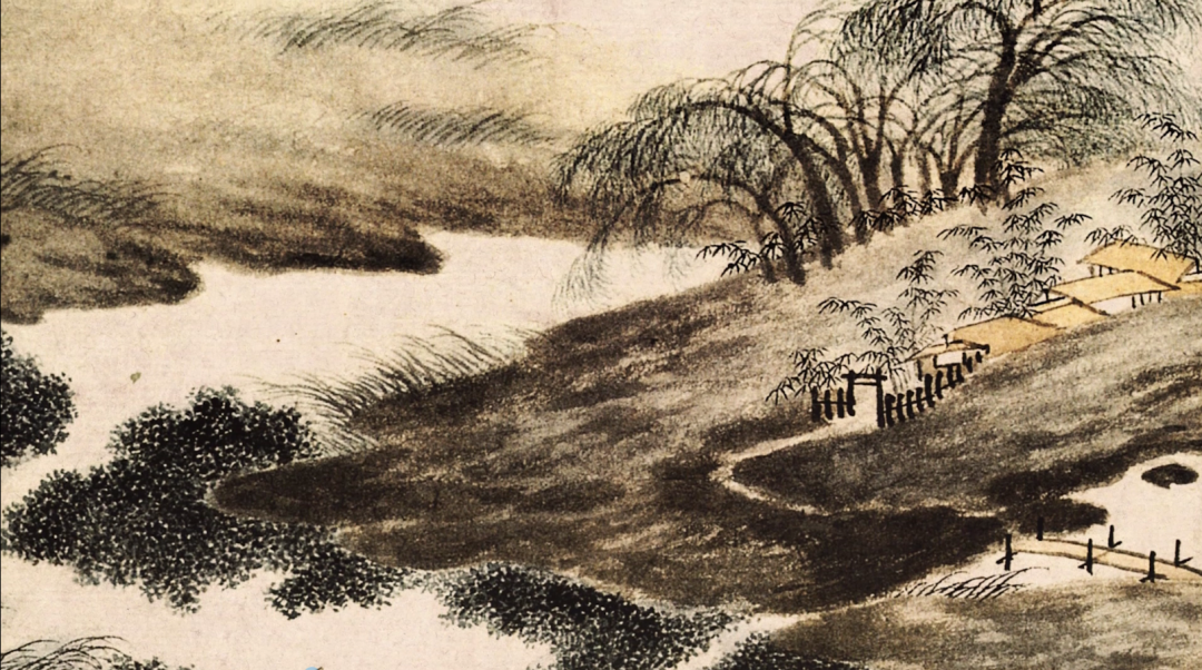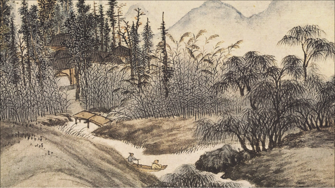 《东庄图》是沈周为其好友吴宽的私家园林东庄所绘,作者以水作为重要元素,细笔精妙绝伦,粗笔写意传神,精准地把握着园林的地理位置与园林特色。将清透水色与浓重墨色、浅淡绛色的相汇相融,取得了出色的色彩表现效果。