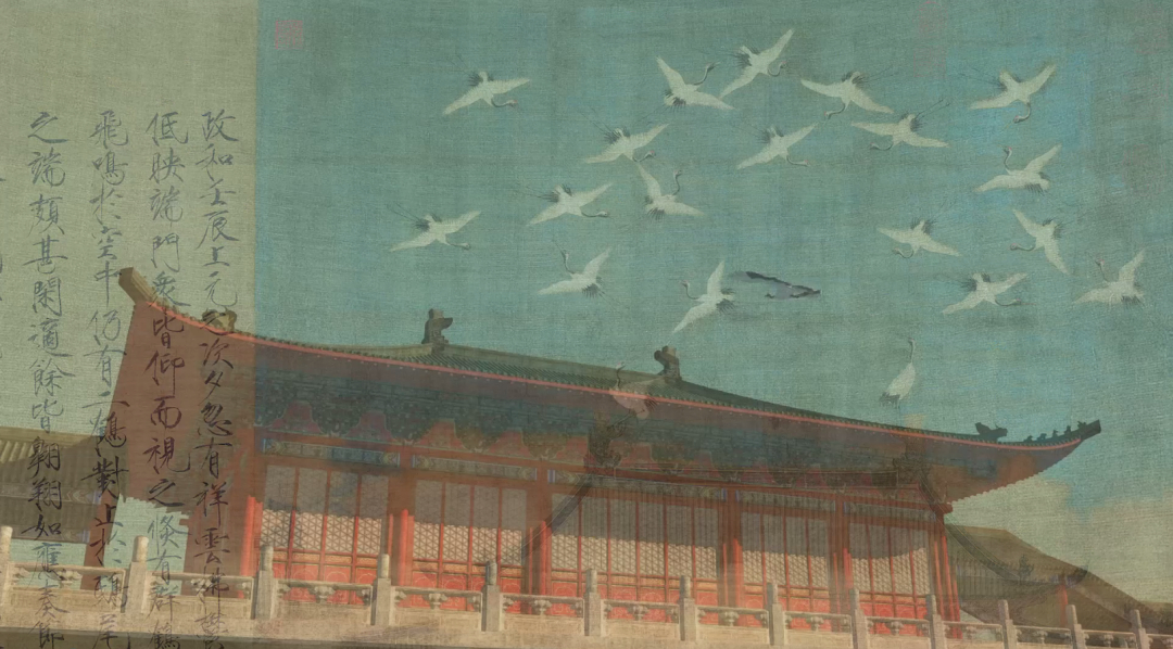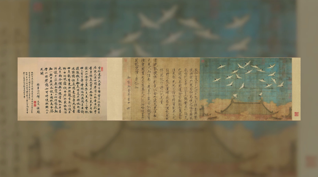 《瑞鹤图》描绘了鹤群盘旋于宫殿之上的壮观景象,构图一改传统,一线屋檐反衬飞鹤布满天空,又赋予画面故事情节,是超现实主义的表现手法。仙鹤姿态百变,各具特色。