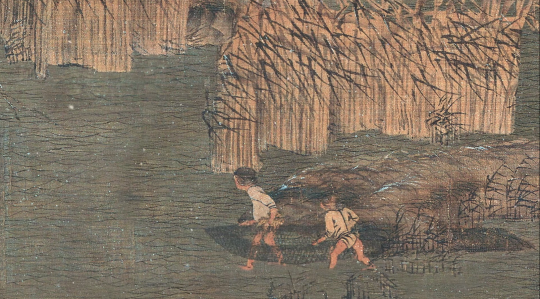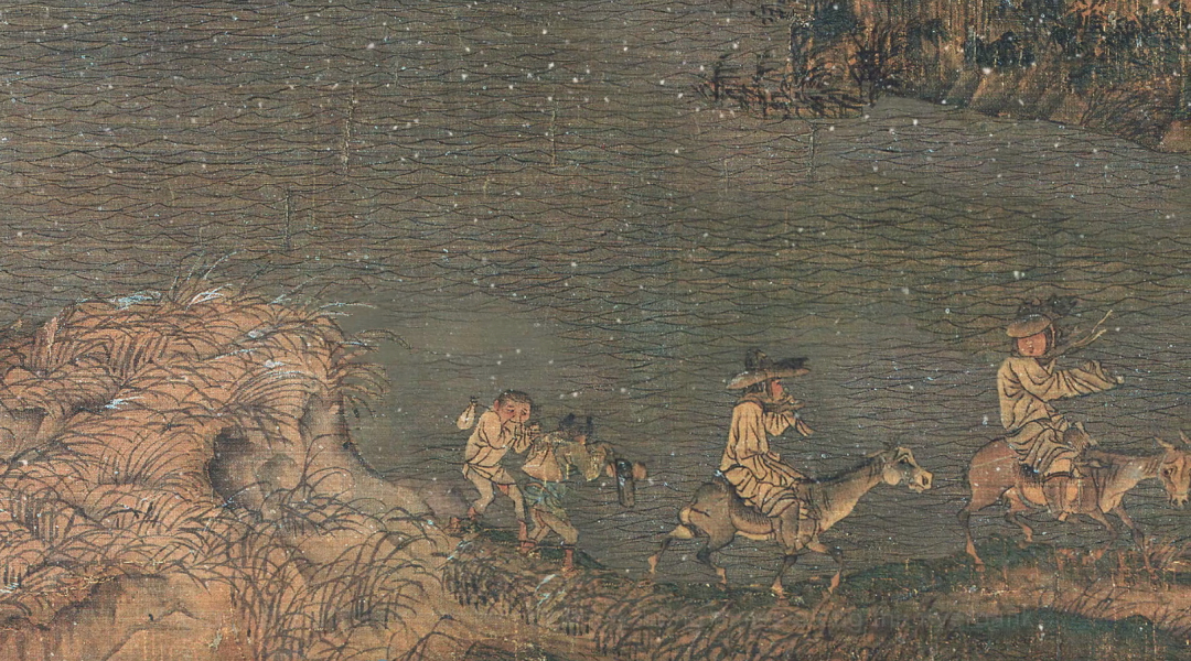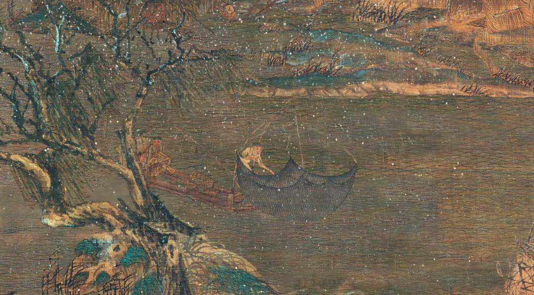 《江行初雪图》全卷描写长江沿岸渔村初雪人们劳作的情景,独取近景、中景的表现形式,一如今日摄影中的特写技法。这种技法的使用把山水画中的人物进行了放大,使众多的人物浓缩在面前的一个近景中,使山水画中常常作为点缀的人物成为画面中的主角之一。
