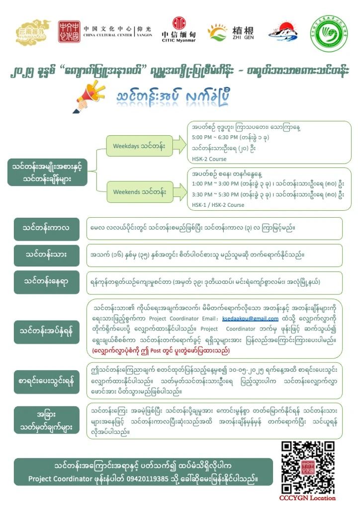 အားလုံးစောင့်မျှော်နေကြတဲ့ တရုတ်ဘာသာစကားသင်တန်းကို မေလ လလယ်ပိုင်းမှာ ဖွင့်လှစ်တော့မှာပဲ ဖြစ်ပါတယ်။ ယခုအကြိမ် သင်တန်းမှာ HSK 1 / HSK 2 Course တွေကို တန်းခွဲ (၇) ခု ဖွင့်လှစ်သွားပြီး သင်တန်းချိန်တွေကိုလည်း စနေ၊တနင်္ဂနွေပိတ်ရက်သင်တန်းရော ကြားရက်သင်တန်းပါ (၂) မျိုးစလုံးကို စီစဉ်ပေးထားပါတယ်။ သင်တန်းကြေးအခမဲ့ဖြင့် တက်ရောက်နိုင်မှာ ဖြစ်တဲ့အတွက် တရုတ်စာလေ့လာသင်ယူလိုသူများအတွက် သတင်းကောင်းလေးပါပဲ။ သင်တန်းသားဦီးရေ ကန့်သတ်ထားတာကြောင့် စိတ်ပါဝင်စားသူများအနေနဲ့ အမြန်ဆုံး လာရောက်စာရင်းပေးသွင်းဖို့ ဖိတ်ခေါ်လိုက်ရပါတယ်……