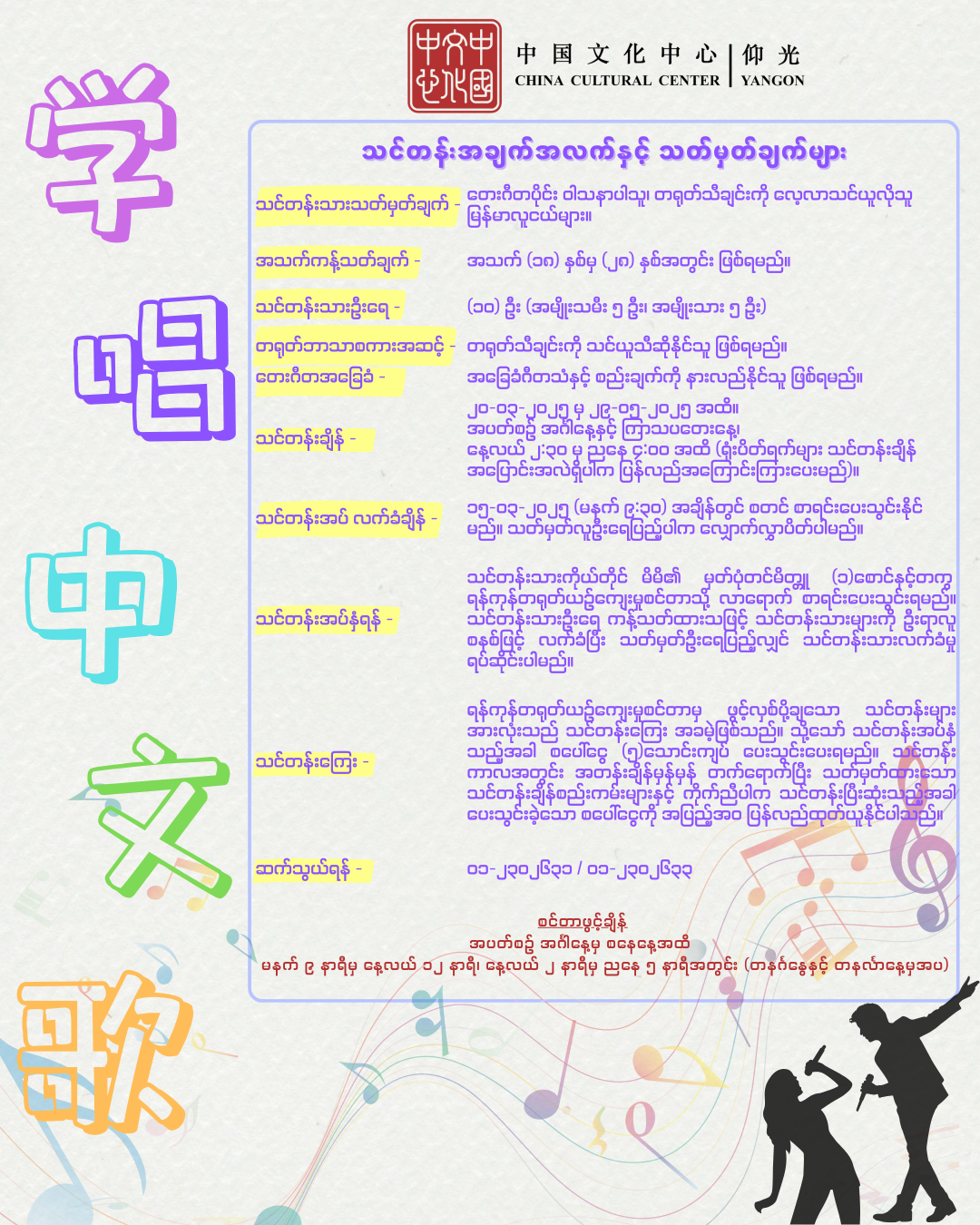သင်က တေးဂီတကို နှစ်သက်သူတစ်ဦးလား? တရုတ်သီချင်းတွေကို သင်ယူလိုပါသလား? အားလုံးစောင့်မျှော်နေကြတဲ့ ရန်ကုန်တရုတ်ယဉ်ကျေးမှုစင်တာရဲ့ ၂၀၂၅ ခုနှစ် နွေရာသီ “တရုတ်သီချင်းဆိုသင်တန်း”ကို မကြာခင် ဖွင့်လှစ်တော့မှာ ဖြစ်ပါတယ်။ ဒီသင်တန်းမှာ ဘာသာစကားသင်ယူမှုနဲ့ တေးဂီတလေ့ကျင့်မှုတိုကို ပေါင်းစပ်သင်ကြားပေးသွားမှာဖြစ်...