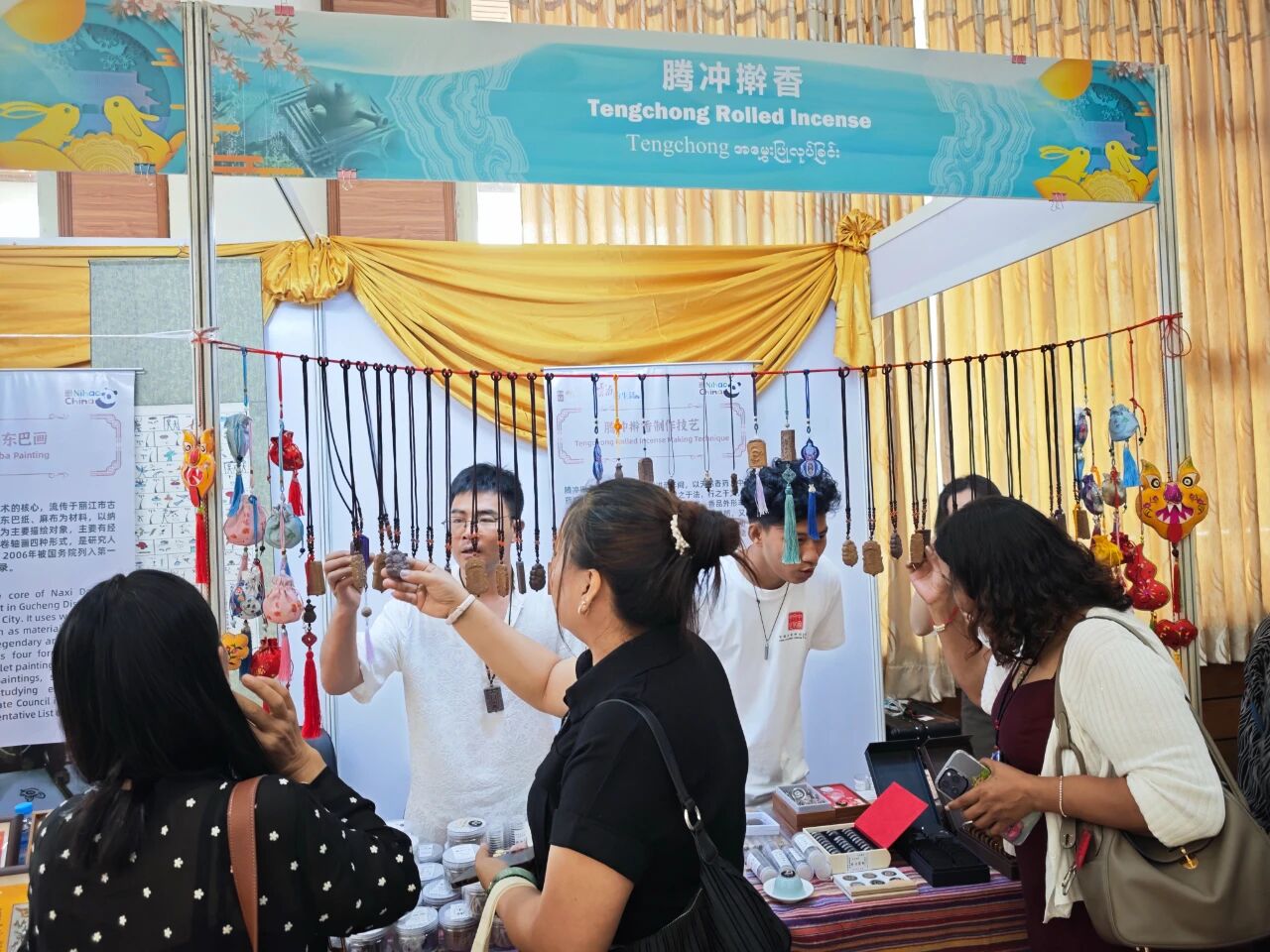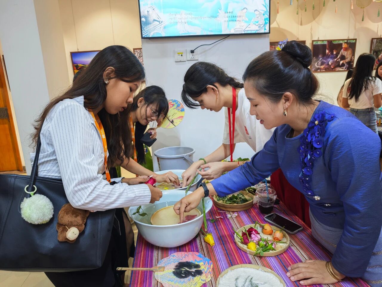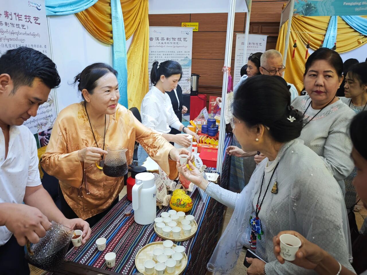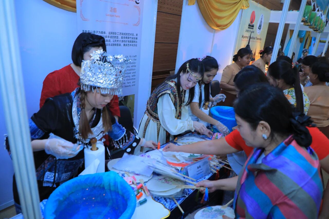 在云南非遗文化展示体验区,彝族(花腰)刺绣、彝族(花腰)剪纸、白族扎染、傣族传统手工造纸、纳西族东巴画、腾冲擀香夺人眼球,展台前人头攒动;青少年则或热衷于埋头“甲马”拓印,或奔走于书法展台与漆扇体验展台之间,请缅华书画协会的老师们在扇面题上汉字,用中华文化符号制作出独属于自己的“精彩”。茶文化体验区,云南酸角糕、大理话梅以及鲜花饼、云腿酥、滇式月饼不断撞击着人们的味蕾,嘉宾们依次品尝凤庆滇红茶、普洱贡茶、大益茶、德昂族酸茶、黑茶,体会另一种“中国味道”。在缅甸文化和美食体验区,众多观众兴致勃勃地体验“特纳卡”在脸颊涂抹出吉祥的图案,咀嚼“拌茶叶”带来的当地节庆风情。