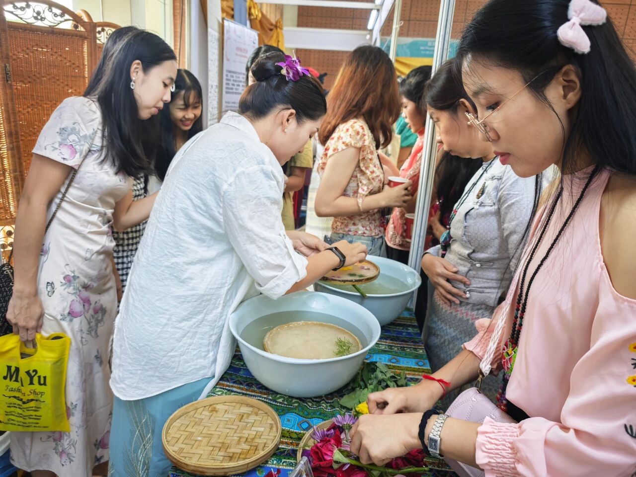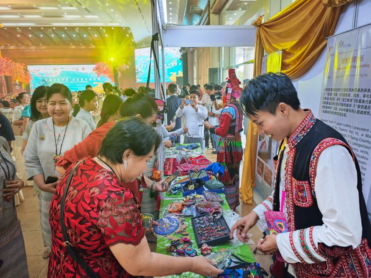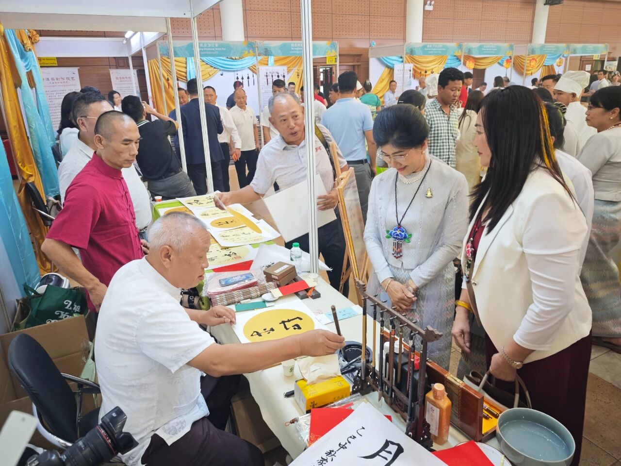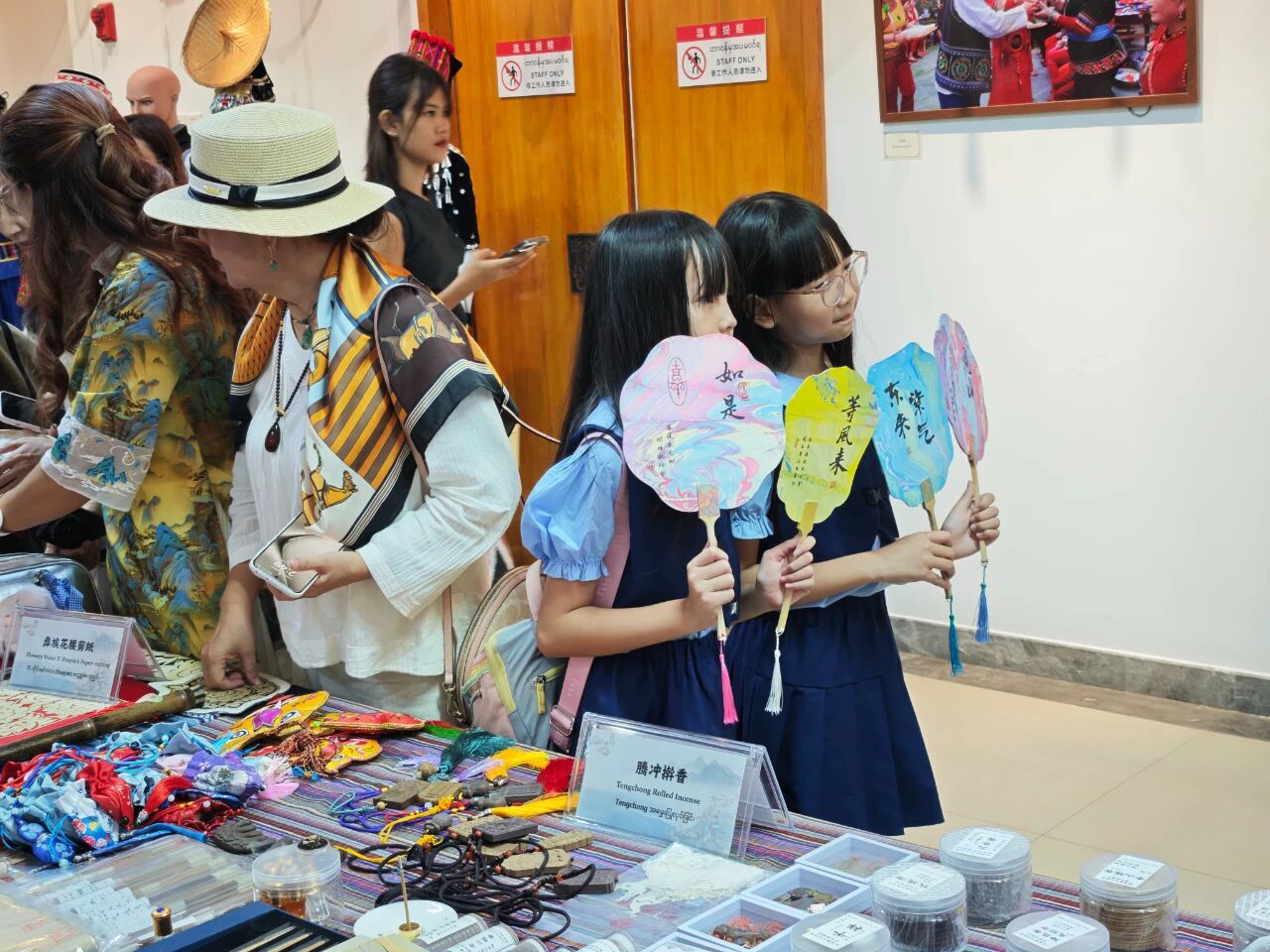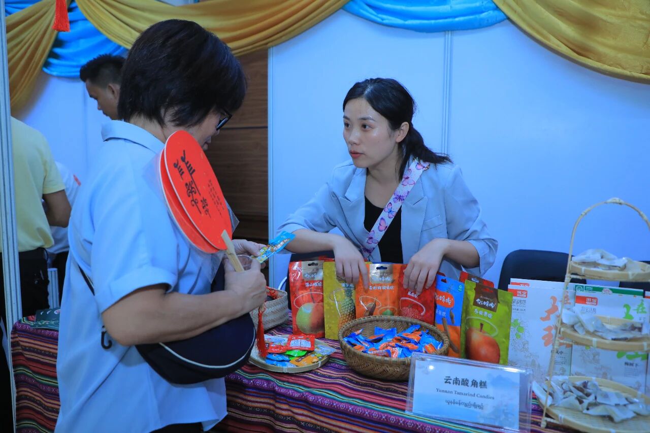 在云南非遗文化展示体验区,彝族(花腰)刺绣、彝族(花腰)剪纸、白族扎染、傣族传统手工造纸、纳西族东巴画、腾冲擀香夺人眼球,展台前人头攒动;青少年则或热衷于埋头“甲马”拓印,或奔走于书法展台与漆扇体验展台之间,请缅华书画协会的老师们在扇面题上汉字,用中华文化符号制作出独属于自己的“精彩”。茶文化体验区,云南酸角糕、大理话梅以及鲜花饼、云腿酥、滇式月饼不断撞击着人们的味蕾,嘉宾们依次品尝凤庆滇红茶、普洱贡茶、大益茶、德昂族酸茶、黑茶,体会另一种“中国味道”。在缅甸文化和美食体验区,众多观众兴致勃勃地体验“特纳卡”在脸颊涂抹出吉祥的图案,咀嚼“拌茶叶”带来的当地节庆风情。