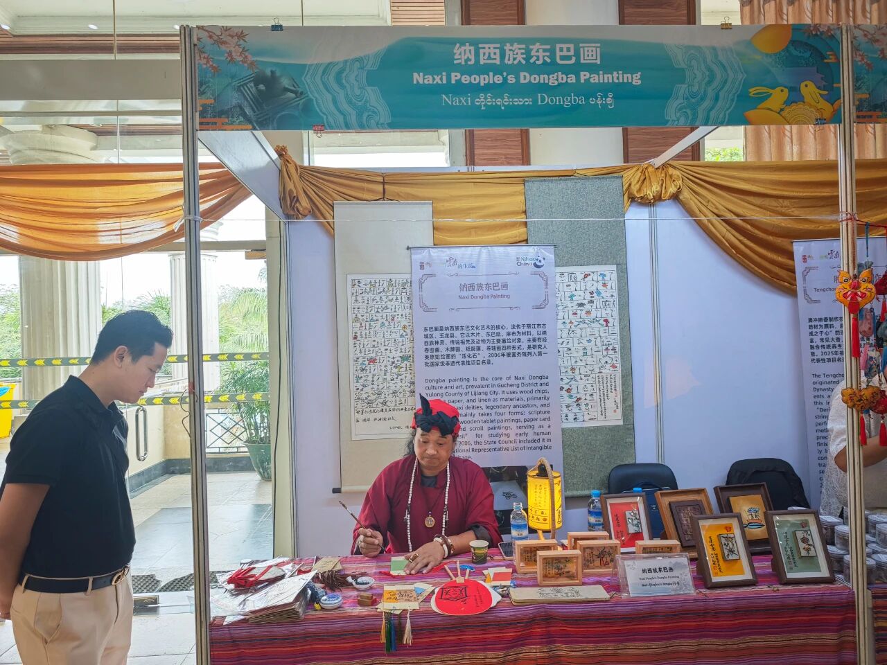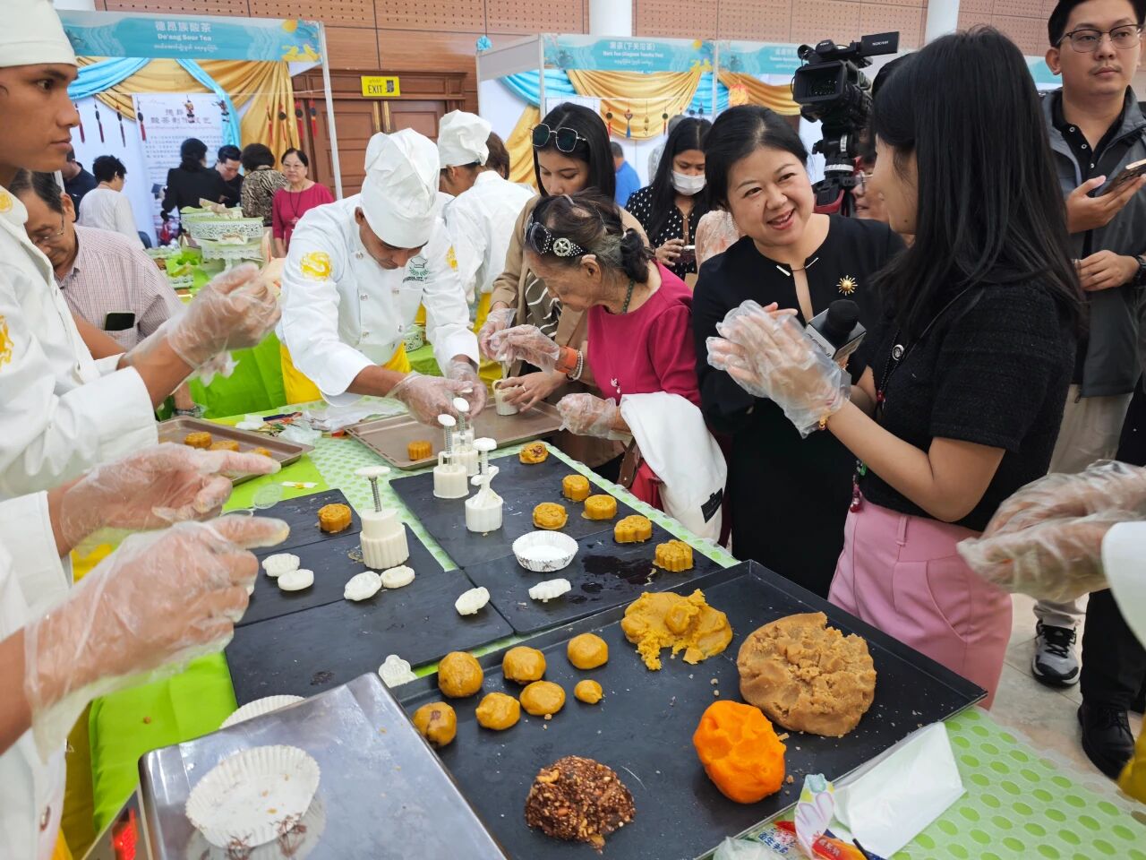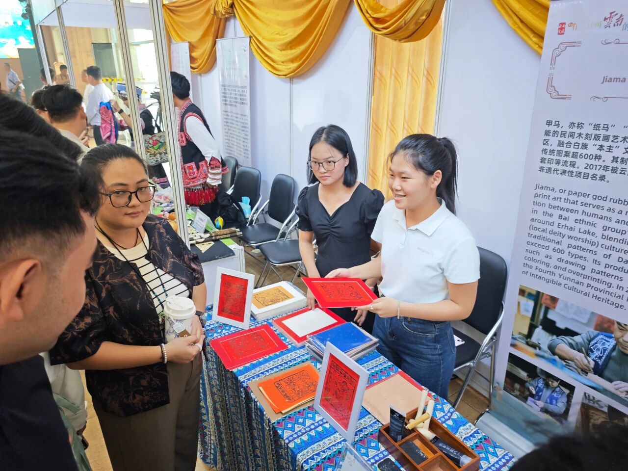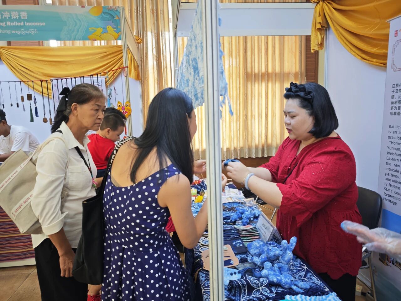 在云南非遗文化展示体验区,彝族(花腰)刺绣、彝族(花腰)剪纸、白族扎染、傣族传统手工造纸、纳西族东巴画、腾冲擀香夺人眼球,展台前人头攒动;青少年则或热衷于埋头“甲马”拓印,或奔走于书法展台与漆扇体验展台之间,请缅华书画协会的老师们在扇面题上汉字,用中华文化符号制作出独属于自己的“精彩”。茶文化体验区,云南酸角糕、大理话梅以及鲜花饼、云腿酥、滇式月饼不断撞击着人们的味蕾,嘉宾们依次品尝凤庆滇红茶、普洱贡茶、大益茶、德昂族酸茶、黑茶,体会另一种“中国味道”。在缅甸文化和美食体验区,众多观众兴致勃勃地体验“特纳卡”在脸颊涂抹出吉祥的图案,咀嚼“拌茶叶”带来的当地节庆风情。