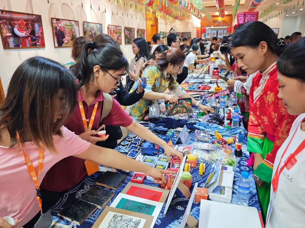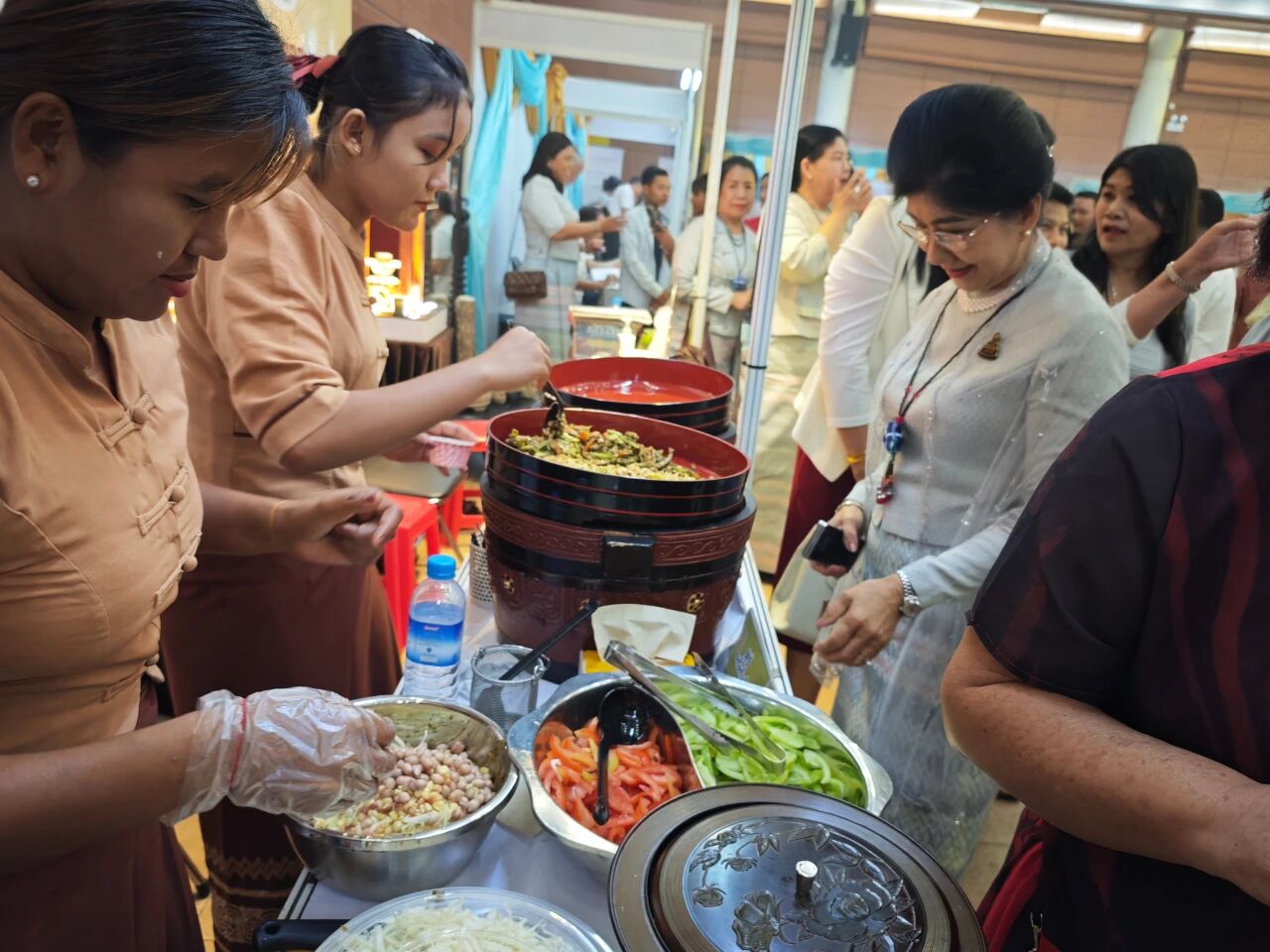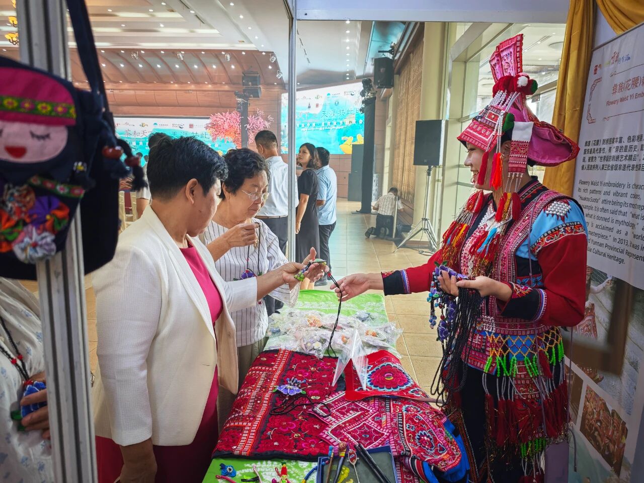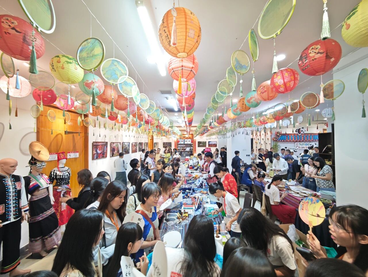 在云南非遗文化展示体验区,彝族(花腰)刺绣、彝族(花腰)剪纸、白族扎染、傣族传统手工造纸、纳西族东巴画、腾冲擀香夺人眼球,展台前人头攒动;青少年则或热衷于埋头“甲马”拓印,或奔走于书法展台与漆扇体验展台之间,请缅华书画协会的老师们在扇面题上汉字,用中华文化符号制作出独属于自己的“精彩”。茶文化体验区,云南酸角糕、大理话梅以及鲜花饼、云腿酥、滇式月饼不断撞击着人们的味蕾,嘉宾们依次品尝凤庆滇红茶、普洱贡茶、大益茶、德昂族酸茶、黑茶,体会另一种“中国味道”。在缅甸文化和美食体验区,众多观众兴致勃勃地体验“特纳卡”在脸颊涂抹出吉祥的图案,咀嚼“拌茶叶”带来的当地节庆风情。