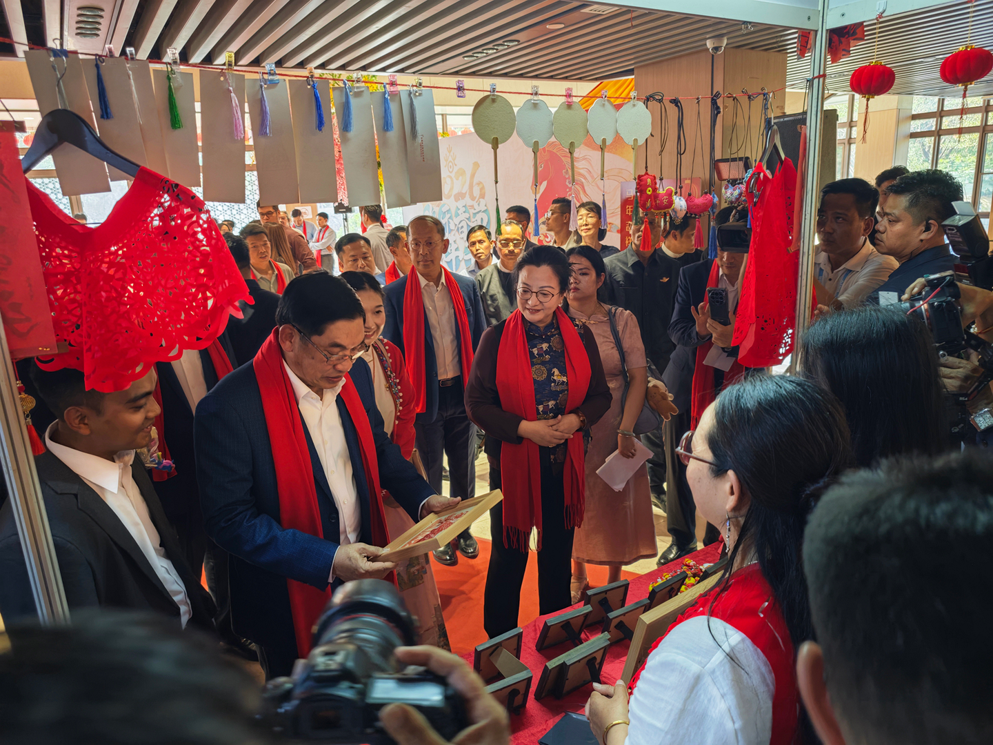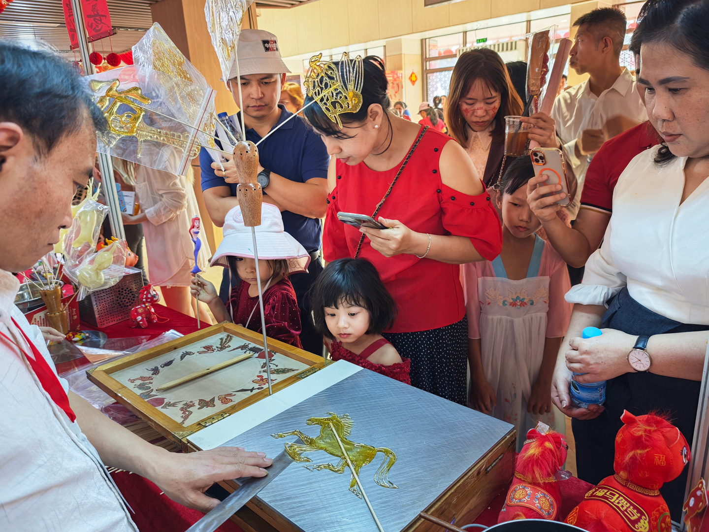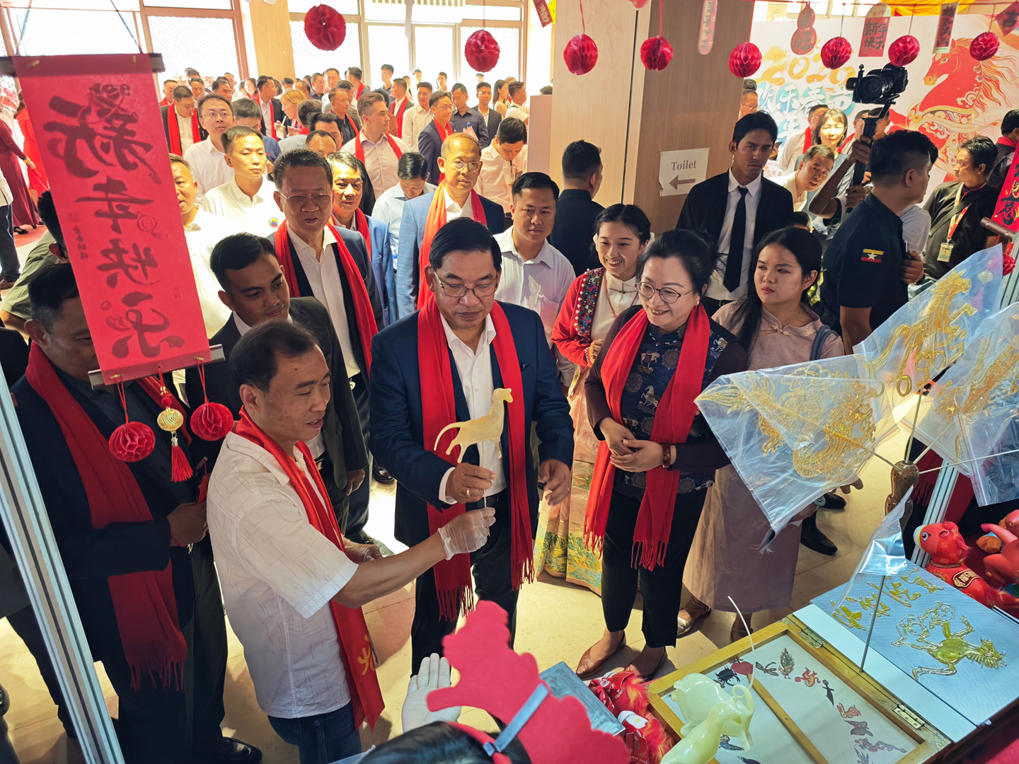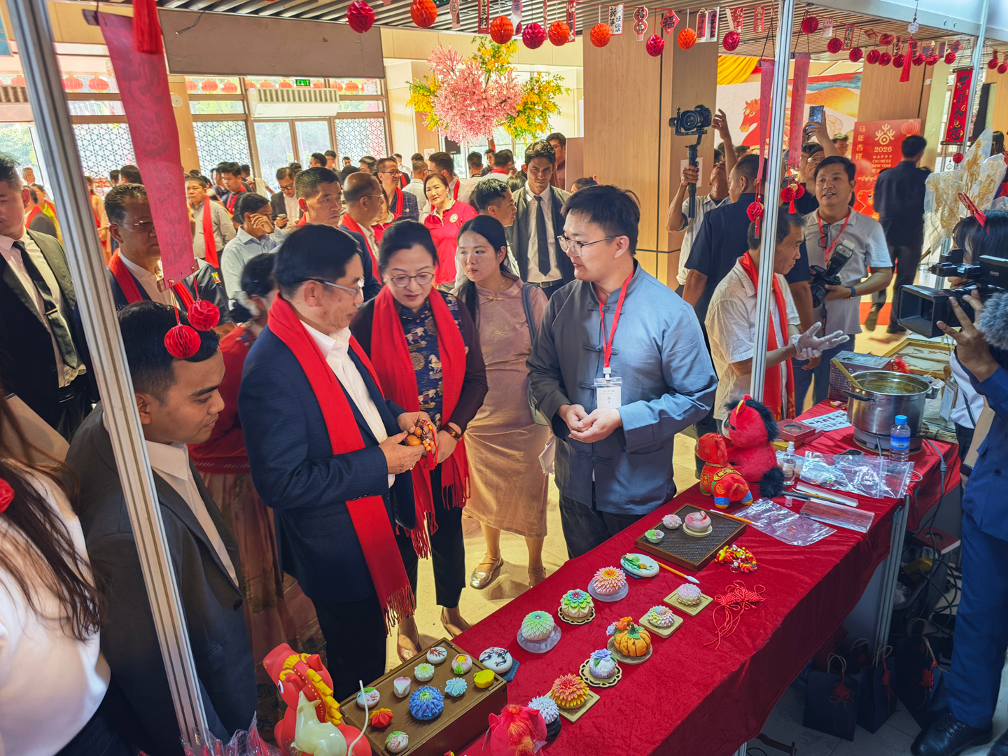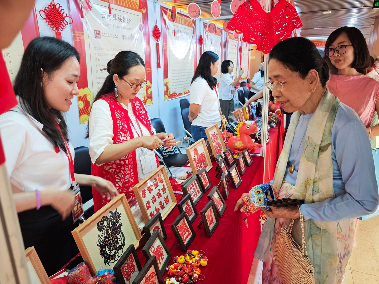 活动特设“春节集市”,联动中缅机构、商会、社团共同参与,集中展示中华节庆习俗、书法艺术、现代科技成果及中国各地传统美食、代表性景观。非遗沉浸式体验成为全场亮点:中国非遗传承人现场展演刺绣、剪纸、葫芦画、糖画、吹糖人、糖果子等传统技艺,搭配云南咖啡、茶叶、鲜花饼等特色物产,从视觉、听觉、味觉、触觉多维度呈现中华文化的厚重与鲜活。互动中,文化从单向展示变为双向共鸣,上千份非遗文创礼品被迅速认领,不少民众主动咨询了解,彰显民间文化交流的旺盛活力与持久生命力。