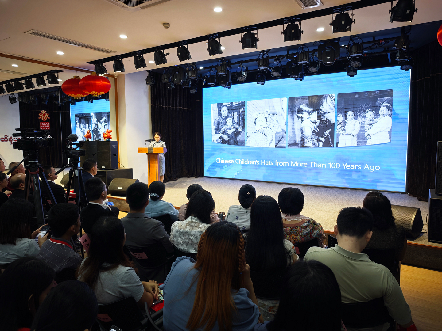 本次展览是仰光中国文化中心2026“欢乐春节”系列活动的重要内容,以广西民族服饰为核心载体,聚焦八桂大地多彩民族文化,融合展览展示、文化讲座、视频推介、文艺表演、互动体验等多元形式,全方位展现广西人文风情与中华优秀传统文化魅力。活动现场,《秋趣广西·桂气养人》文旅宣传片生动呈现广西的秀美山水、浓郁民族风情与丰富文旅资源,让观众沉浸式感受“山水甲天下、风情醉人心”的广西韵味;广西民族童帽专题讲座同步开讲,主讲人以精巧童帽为切入点,深入解读其背后的民俗寓意、工艺传承与民族审美,带领观众走进广西非遗文化的细腻世界。