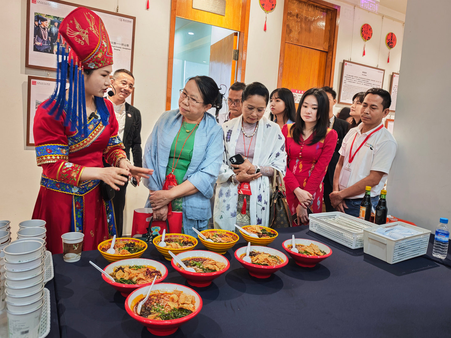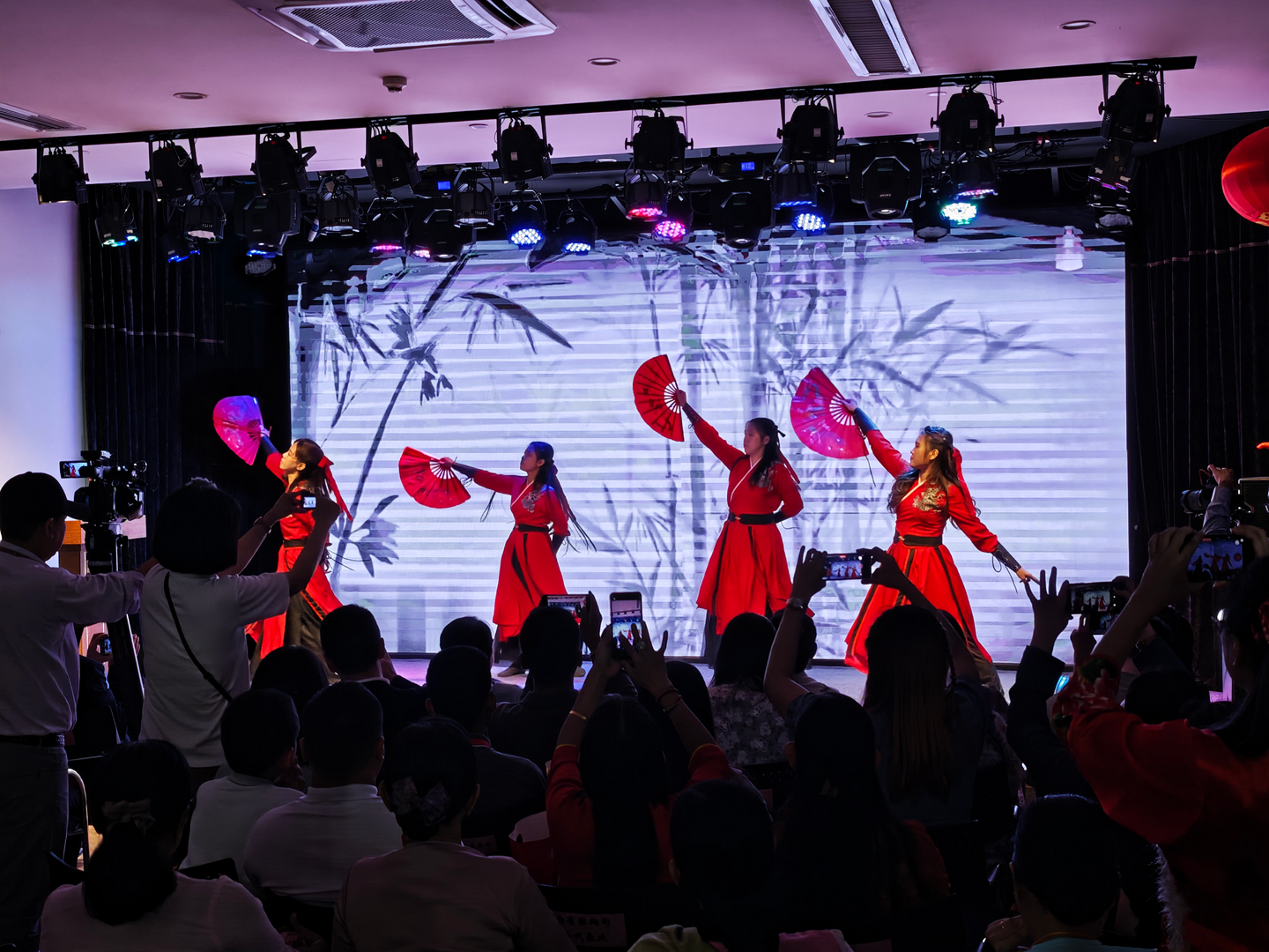 文艺展演与互动体验环节精彩纷呈、人气高涨。缅甸艺术高中与当地华校师生联袂登台,带来融合缅甸传统纺织文化及节日风情的特色舞蹈,以灵动的肢体语言演绎中缅传统工艺与艺术的共通之美,展现两国文化的交融共鸣;广西壮族拼布体验工坊里,小观众们在工作人员指导下涂绘“八桂霓裳”,亲手感受非遗拼布的针线巧思与创作乐趣;螺蛳粉特色品鉴区,地道广西风味传递出节日的烟火温情;缅华书画协会书法家现场挥毫,墨香迎新春、福字送吉祥,将中国年俗文化与新春祝福带给每一位参与者。
