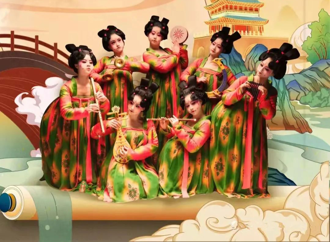 《唐宫夜宴》 一群娇憨可爱的唐宫小姐姐们踩着欢快的古乐节奏翩翩起舞,她们仿佛从古画中走出来,带你梦回盛世大唐,尽享一场宫廷盛宴。 舞台背景从仕女图到泼墨山水画,再到最后平地起宫墙,震撼的视觉效果,让人有种身临其境之感。